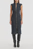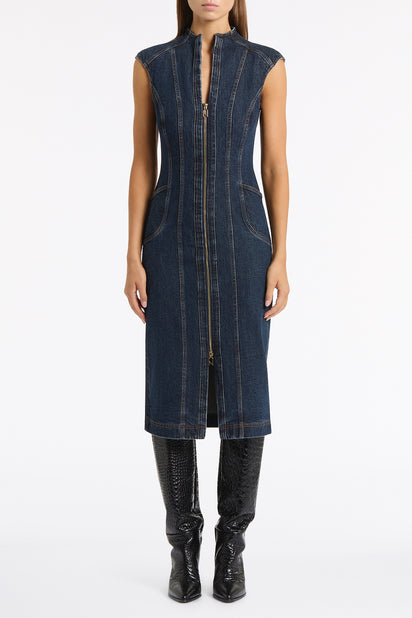 A sculptural denim dress crafted in a dark indigo wash, featuring body-contouring panel lines and a dramatic gold zip through the centre front with custom CZ hardware. Designed to define the silhouette, it transitions effortlessly from day to night styling.