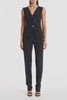 A sharply tailored cropped jacket crafted in classic navy pinstripe, finished with silver CZ crest buttons for a refined statement detail. Structured through the shoulders with a clean, modern silhouette, it is designed to elevate contemporary suiting with polished precision.