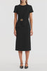 A sculptural midi dress crafted in crepe, featuring short sleeves and a reimagined asymmetric peplum that defines the waist. Finished with a detachable statement gold brooch, this design offers versatility and elevated elegance for event dressing.