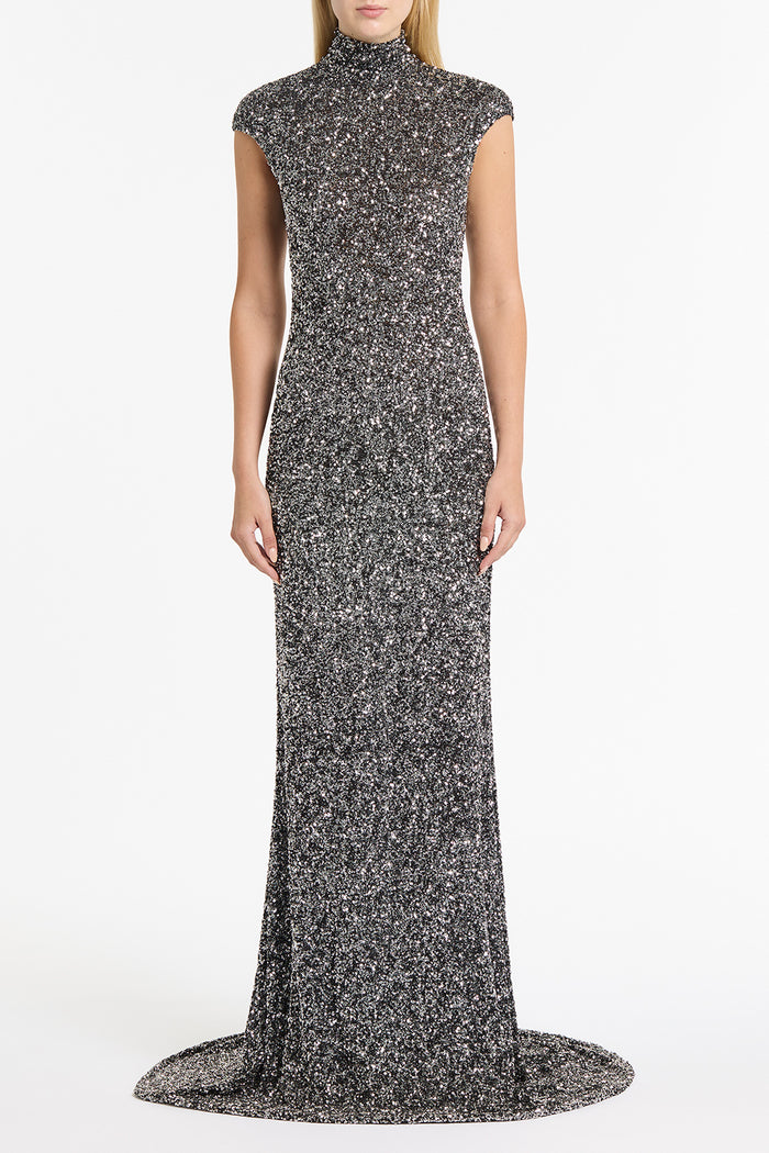 The Chrome Crushed Sequin gown is an exceptional evening piece that gurantees to make a statement. The close fit lengthens the body with the high neck while the semi cap sleeves offer a flattering cut. The glistening sequins catch the light as you move in this limited edition gown.