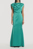 viridian lustre satin shoulder drape gown