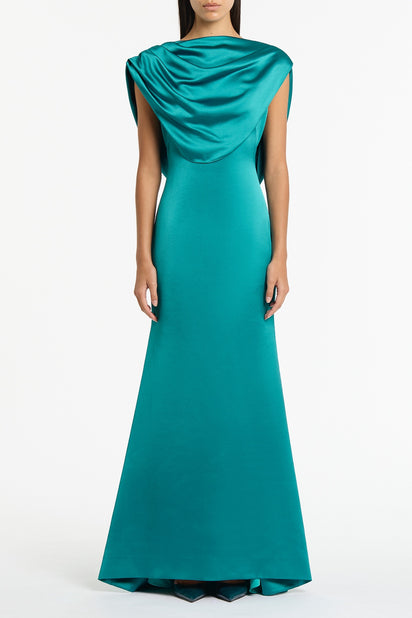 VIRIDIAN LUSTRE SATIN SHOULDER DRAPE GOWN
