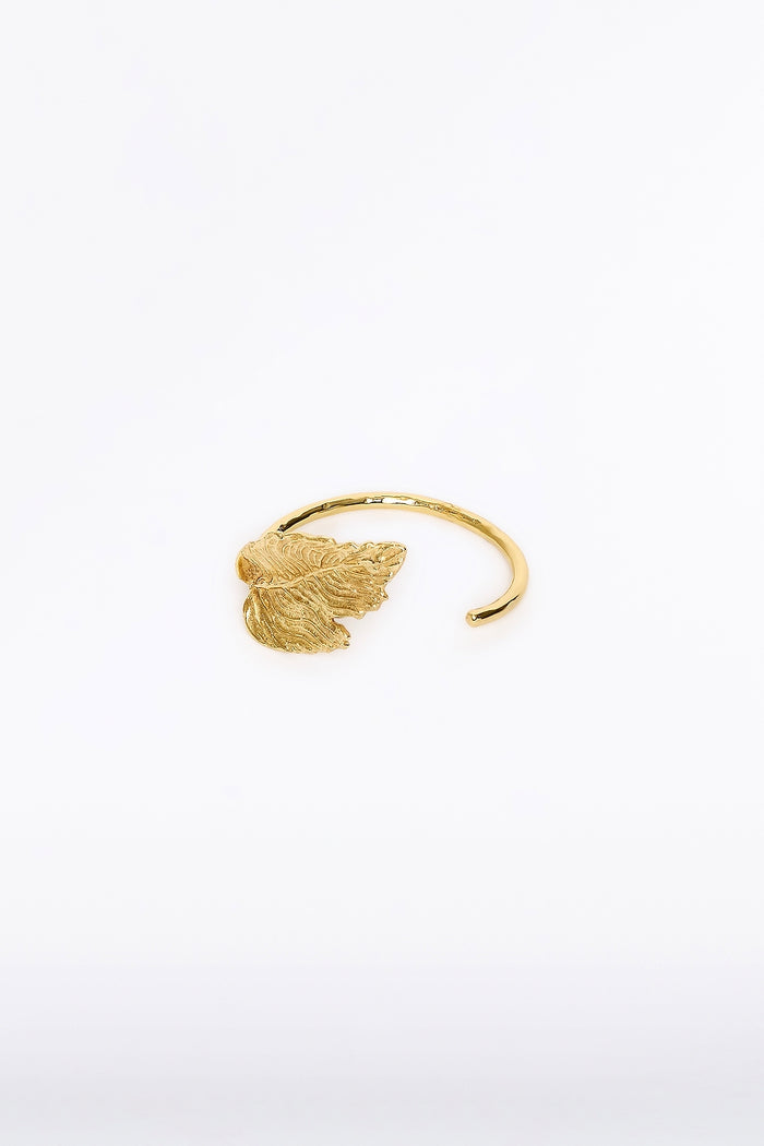 A statement gold cuff featuring an intricate leaf motif, crafted to add refined glamour to any evening ensemble. Perfect for pairing with gowns or sleek tailored looks.