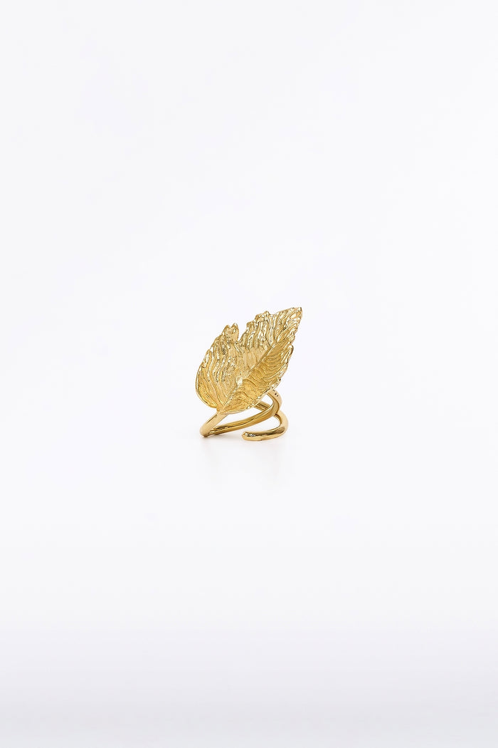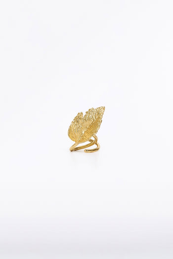 A sculptural statement ring with a gold leaf design, created to complement eveningwear with subtle yet striking sophistication. One size fits most.