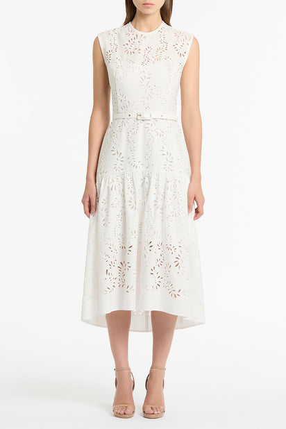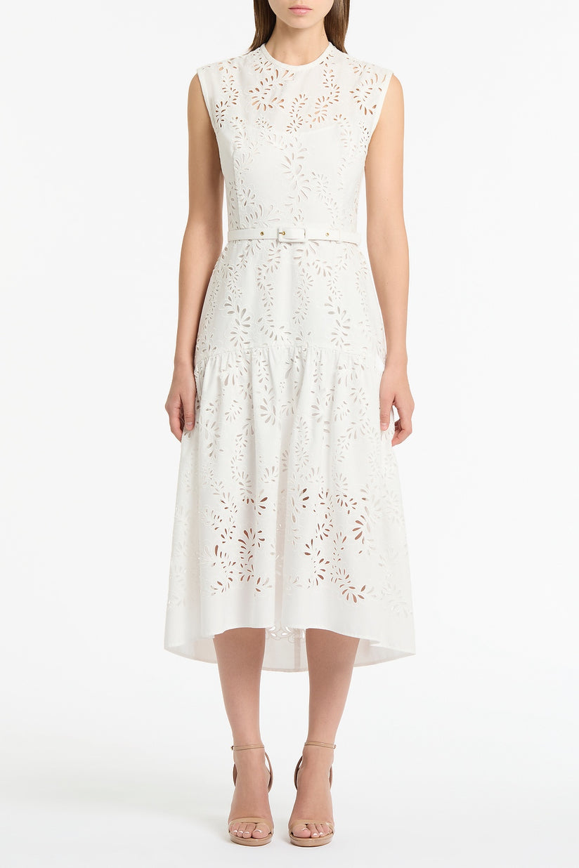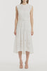 An elegant summer essential, this midi dress features a defined waist, semi cap sleeves, belt and intricate ivory lace broderie, blending fluid movement with subtle structure for polished day-to-evening wear.