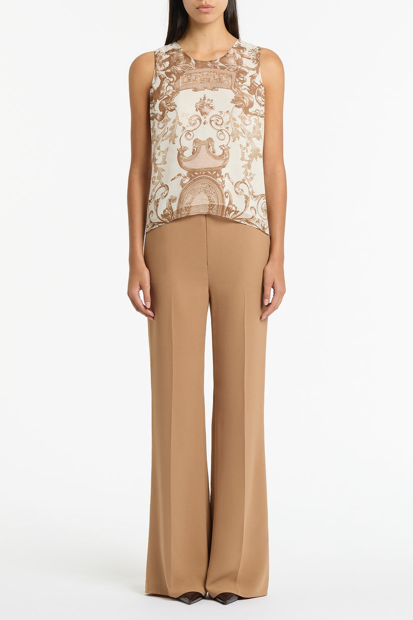 A refined georgette cami showcasing a Renaissance-inspired baroque toile in soft sepia on ivory. Designed with a clean silhouette and fluid drape, it offers effortless versatility for layering under tailoring or styling as a statement on its own.