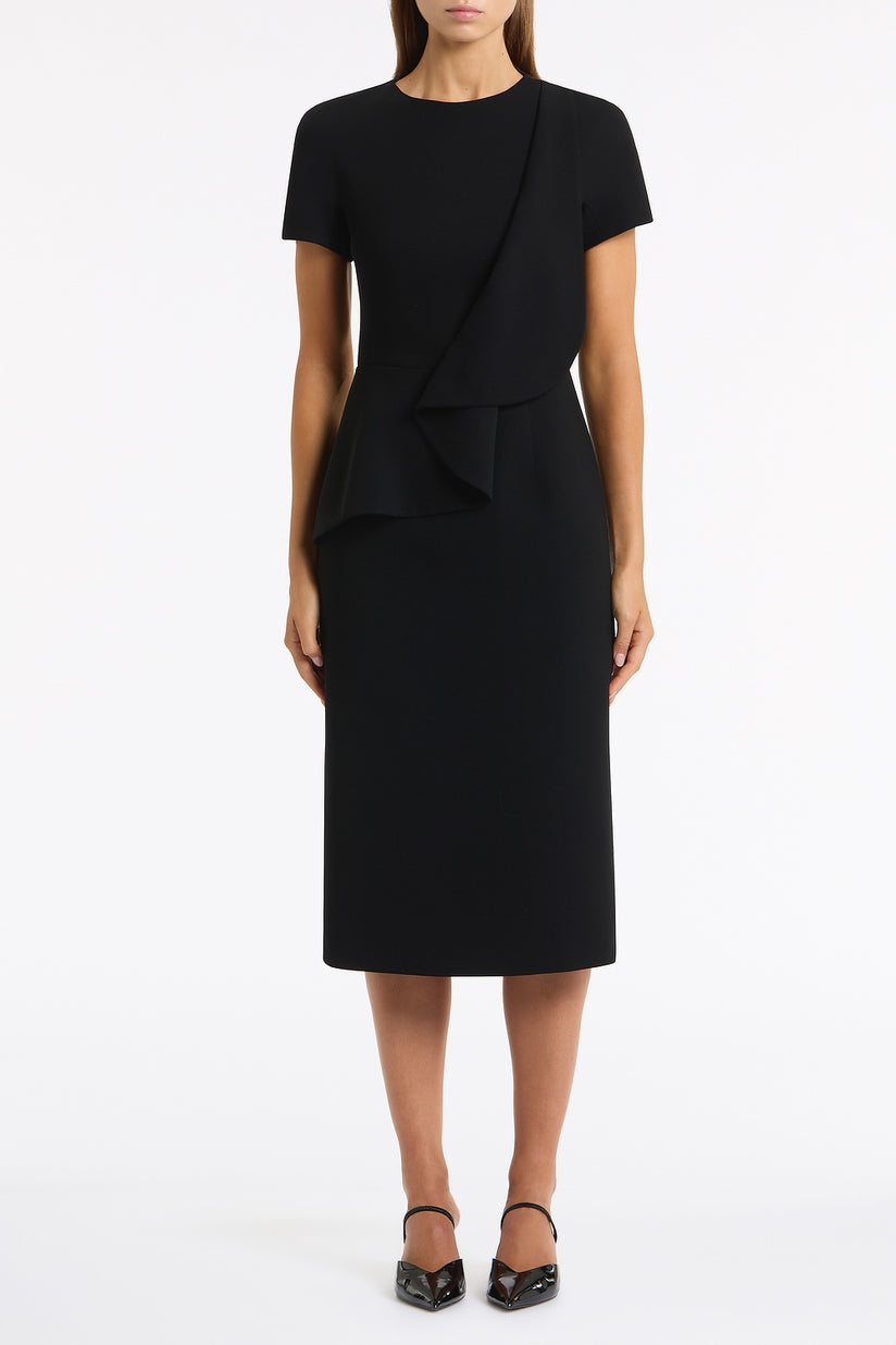 BLACK CREPE DRAPE PEPLUM MIDI DRESS