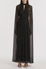 An archival silhouette reimagined for today—this black georgette gown features a high halter neckline and a dramatic sheer cape that falls the length of the dress. A statement of elegance for black tie occasions.