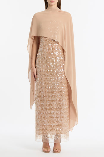 An elegant shoulder cover in fluid fawn-toned fabric, designed to drape effortlessly over gowns, dresses, or tops. The perfect finishing touch to evening ensembles, it adds softness and refinement to any occasion look.