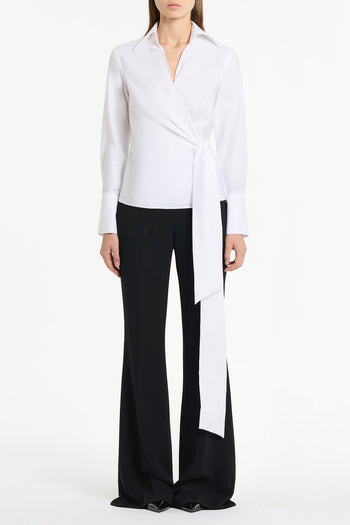 A crisp cotton wrap top designed with long ties to cinch and define the waist, finished with a wide classic collar. A refined yet effortless silhouette for modern day-to-evening styling.